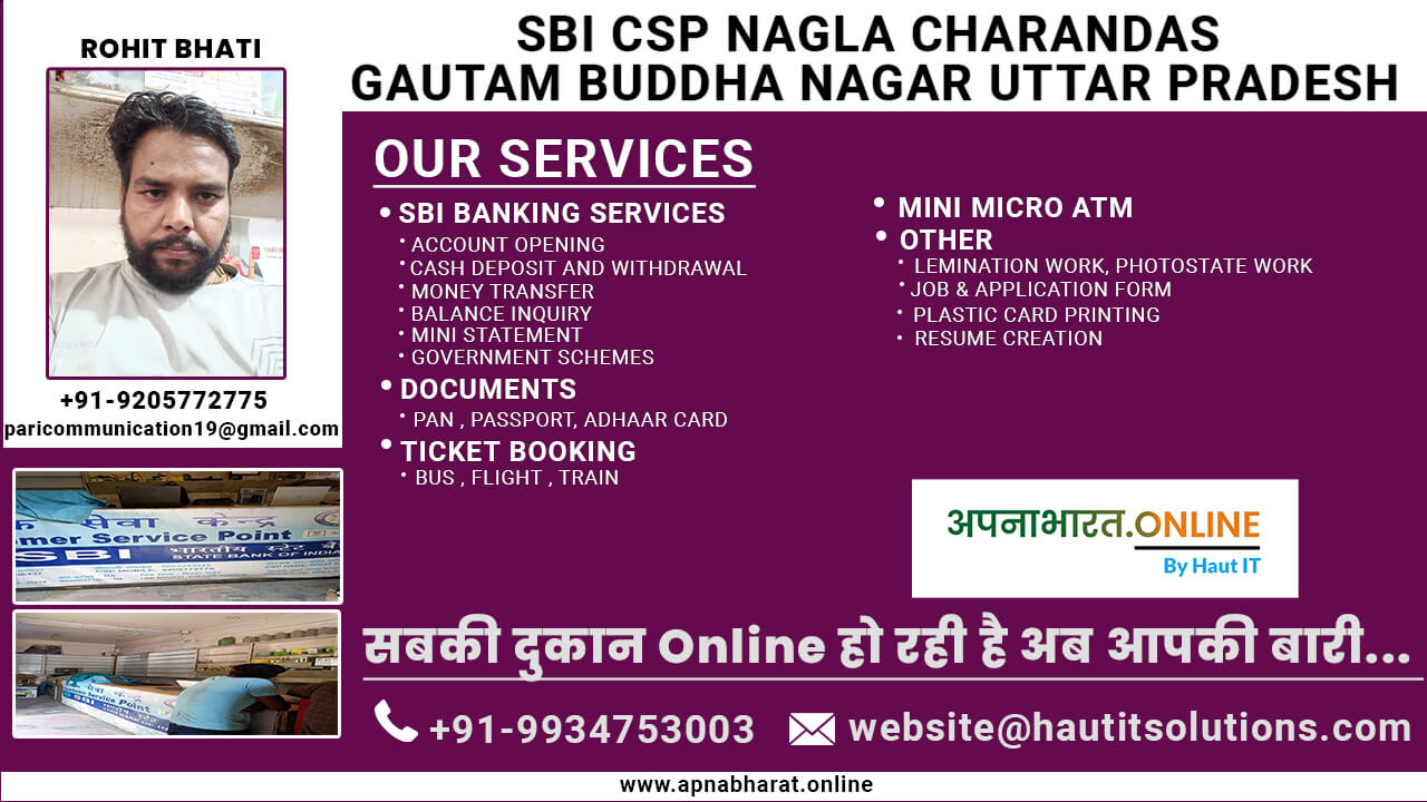 Welcome to Mr. Rohit Bhati’s SBI Customer Service Point, proudly serving the Nagla Charandas area in Gautam Buddha Nagar, Uttar Pradesh for the past year. Our mission is to provide seamless and reliable banking services to our community, ensuring that every customer’s needs are met with efficiency and care.